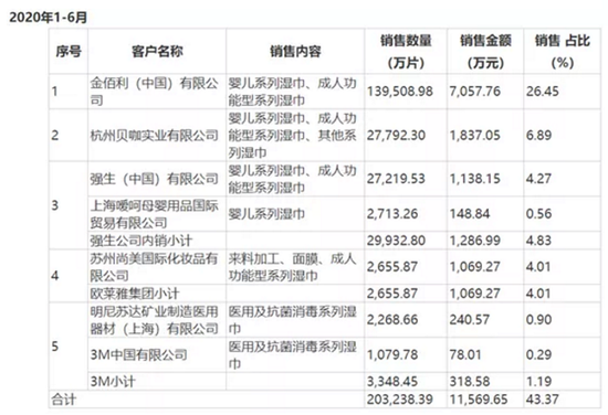 可以发现,2020年1-6月,洁雅股份内销销售收入第五大客户为3M公司,其中包括对3M公司下属的3M中国有限公司和明尼苏达矿业制造医用器材(上海)有限公司,销售金额分别为240.57万元和78.01万元,3M公司合计销售金额为318.58万元。这一金额小于洁雅股份对恒安集团的销售金额594.07万元,因此,恒安集团理应排在内销前五名客户之中,且在3M公司之前。