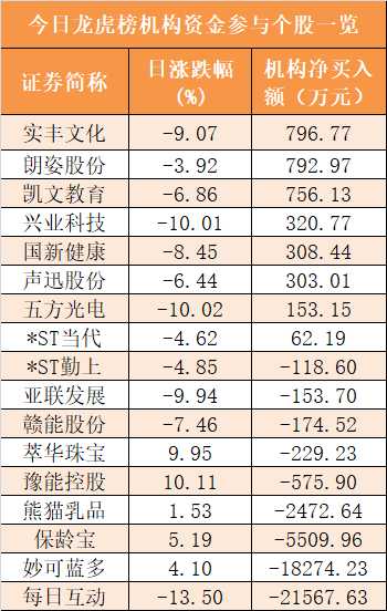 盘后龙虎榜数据显示,机构现身17股,其中实丰文化等8股呈现机构资金净买入,每日互动(维权)等9股呈现机构资金净卖出。