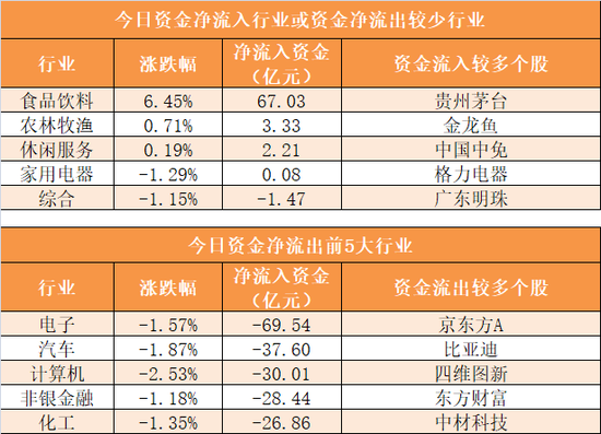 3、食品饮料行业净流入67.03亿元居首