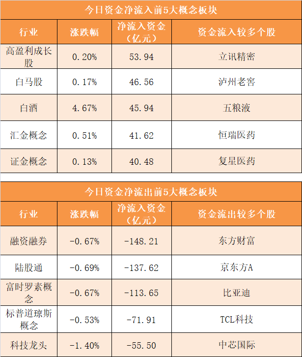 概念板块方面,今日高盈利成长股、白马股、白酒、汇金概念等概念板块资金呈现净流入,其中高盈利成长股概念净流入53.94亿元居首。