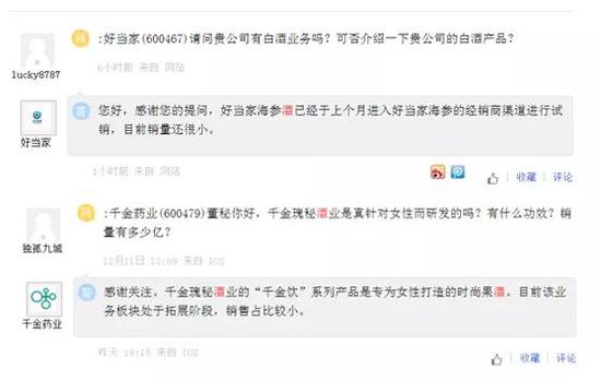 农业股好当家被问有没有白酒业务,公司回复“好当家海参酒已经于上个月进入好当家海参的经销商渠道进行试销,目前销量还很小”。医药股千金药业被问千金瑰秘酒业情况,公司回复表示“千金瑰秘酒业的’千金饮’系列产品是专为女性打造的时尚果酒。目前该业务板块处于拓展阶段,销售占比较小”。
