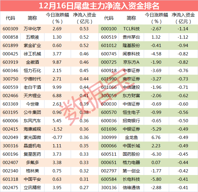 从个股尾盘资金流向数据看,有3股尾盘净流入资金超过5000万元,万华化学、五粮液、紫金矿业等个股尾盘资金净流入金额最多,分别高达0.53亿元、0.52亿元、0.52亿元;TCL科技、贵州茅台、隆基股份等个股尾盘资金净流出金额最多。