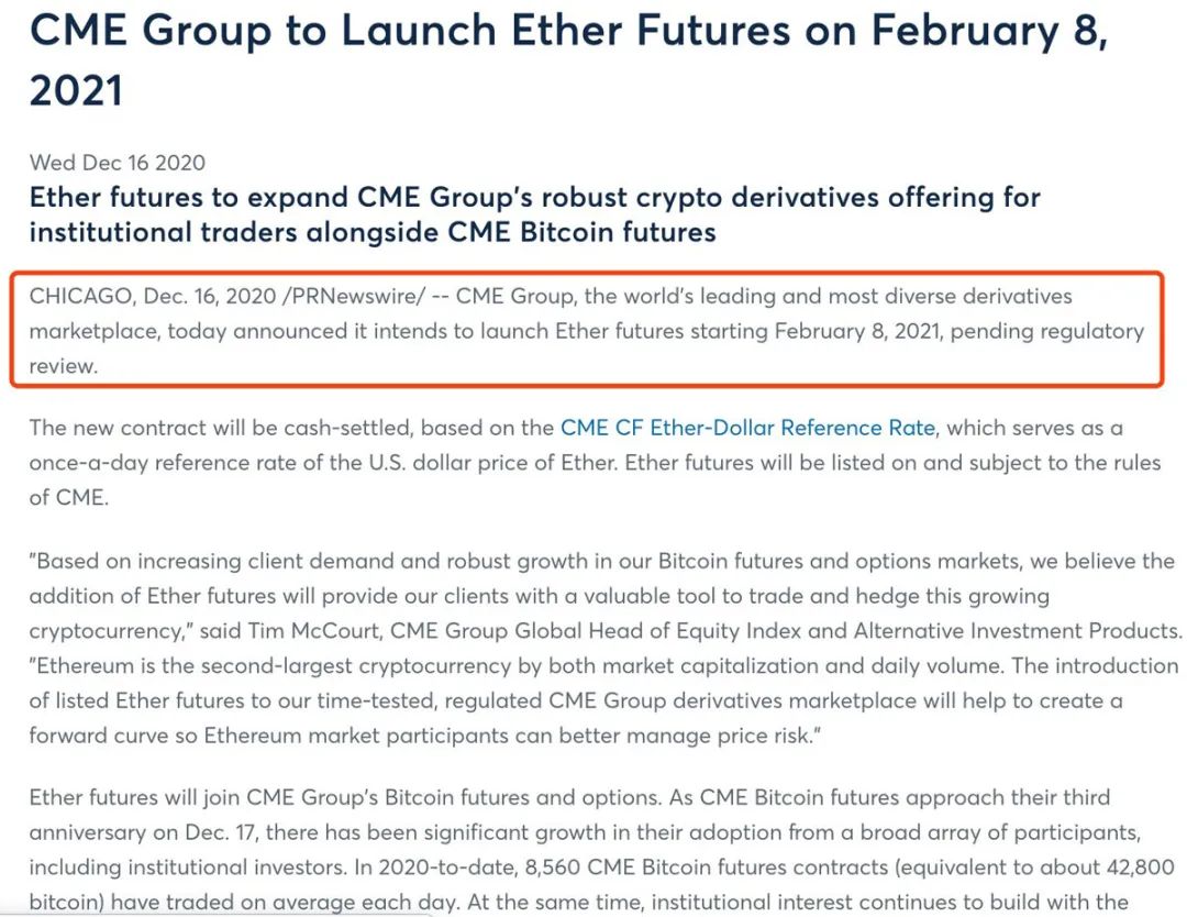 芝加哥商品交易所(CME)股票指数和另类投资产品的全球负责人蒂姆·麦考特(Tim McCourt)表示,以市值和日交易量计算,以太坊是全球第二大加密货币,上市以太坊期货是思虑良久的决定,基于客户需求不断增长以及比特币期货和期权市场的强劲增长,相信以太期货的加入将为客户提供一个有价值的交易和对冲工具。