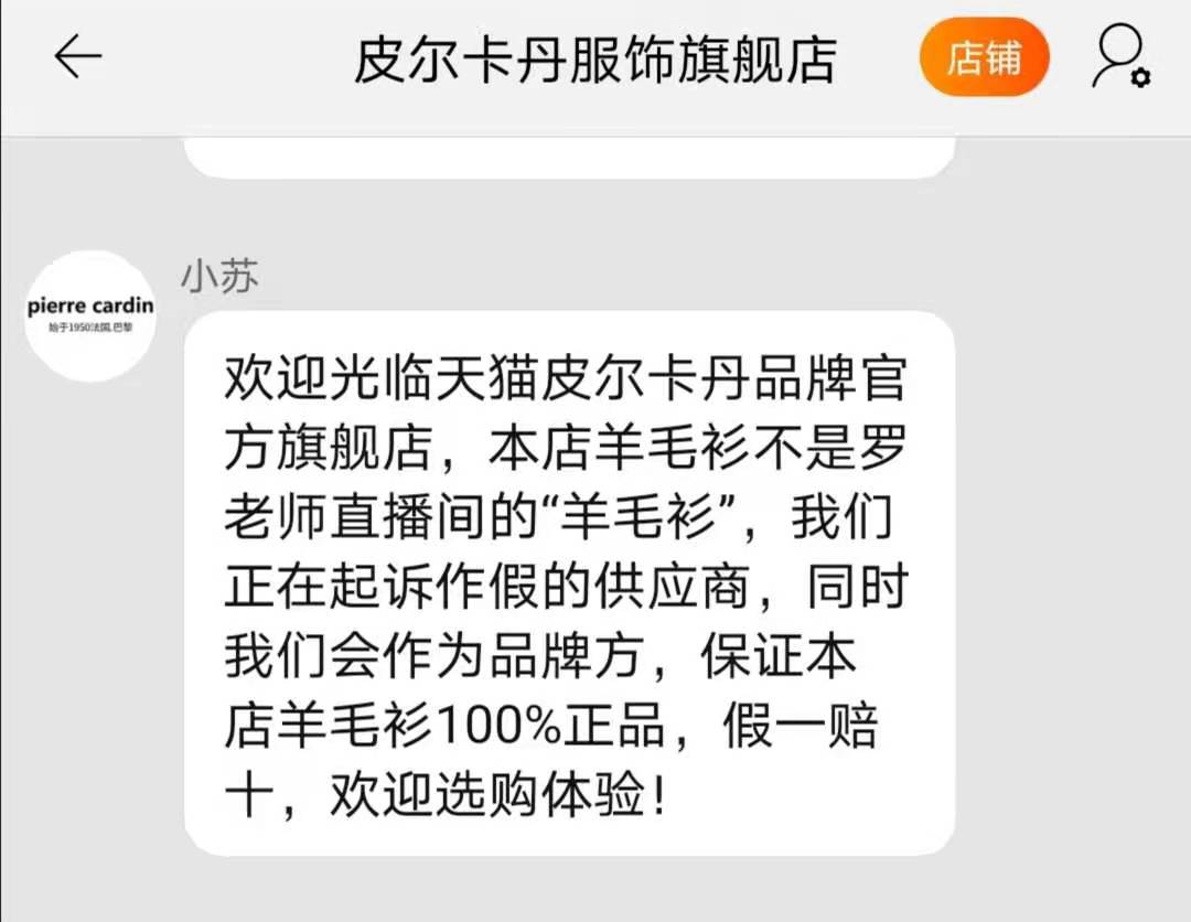 罗永浩于12月15日对“交个朋友”直播间所销售“皮尔卡丹”品牌羊毛衫为假货一事发布声明后,被假冒品牌皮尔卡丹的线上旗舰店亦做出回应。