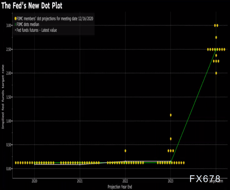 美联储预计将维持利率在当前水平直至2023年,与9月一致。1名委员预计将在2022年加息,5名委员预计将在2023年加息