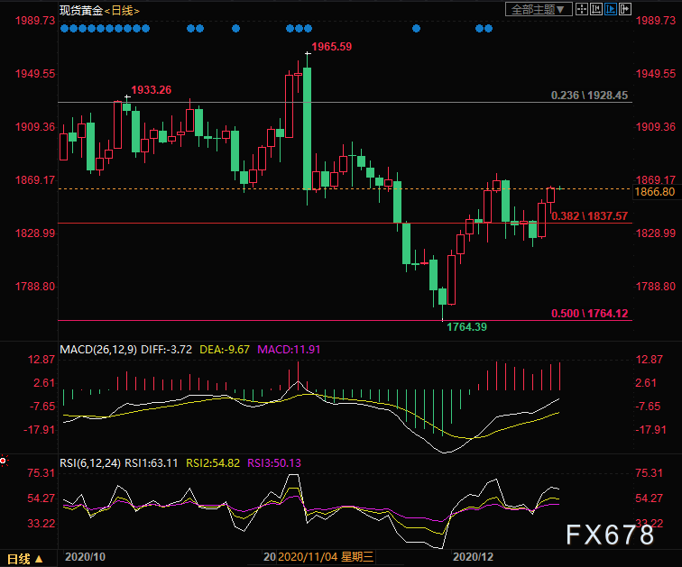 周四(12月17日)现货黄金微涨,交投于1866附近,周三(12月16日)金价涨0.6%至1864.8美元/盎司,之前美联储主席鲍威尔表示美国非常需要财政政策,且美联储在通胀回到正常轨道之前不会先发制人地加息。另外,美国会纾困案接近达成协议以及美国经济数据不佳也帮助金价继续上涨,利多金价的因素盖过了新冠疫苗接种乐观情绪带来的压力。