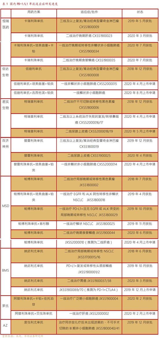 图"国内PD-1/L1单抗适应症获批上市进度(不完全统计);来源:华西证券