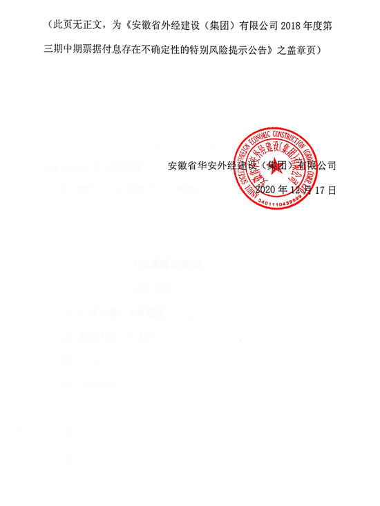 安徽外经建设公告称,“18皖经建MTN003” 应于12月24日兑付利息,由于公司流动性紧张,本期中票付息存在不确定性。本期债券发行金额3.8亿元,票息7.3%。