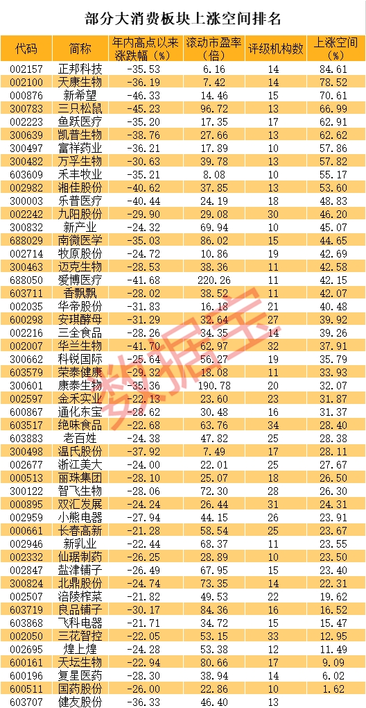 从机构关注度来看,绝味食品、三花智控、华兰生物、双汇发展、九阳股份等个股均有30家以上机构评级,智飞生物、安琪酵母、小熊电器等个股有20多家机构评级。上涨空间方面,正邦科技、天康生物、新希望等个股上涨空间超过70%。