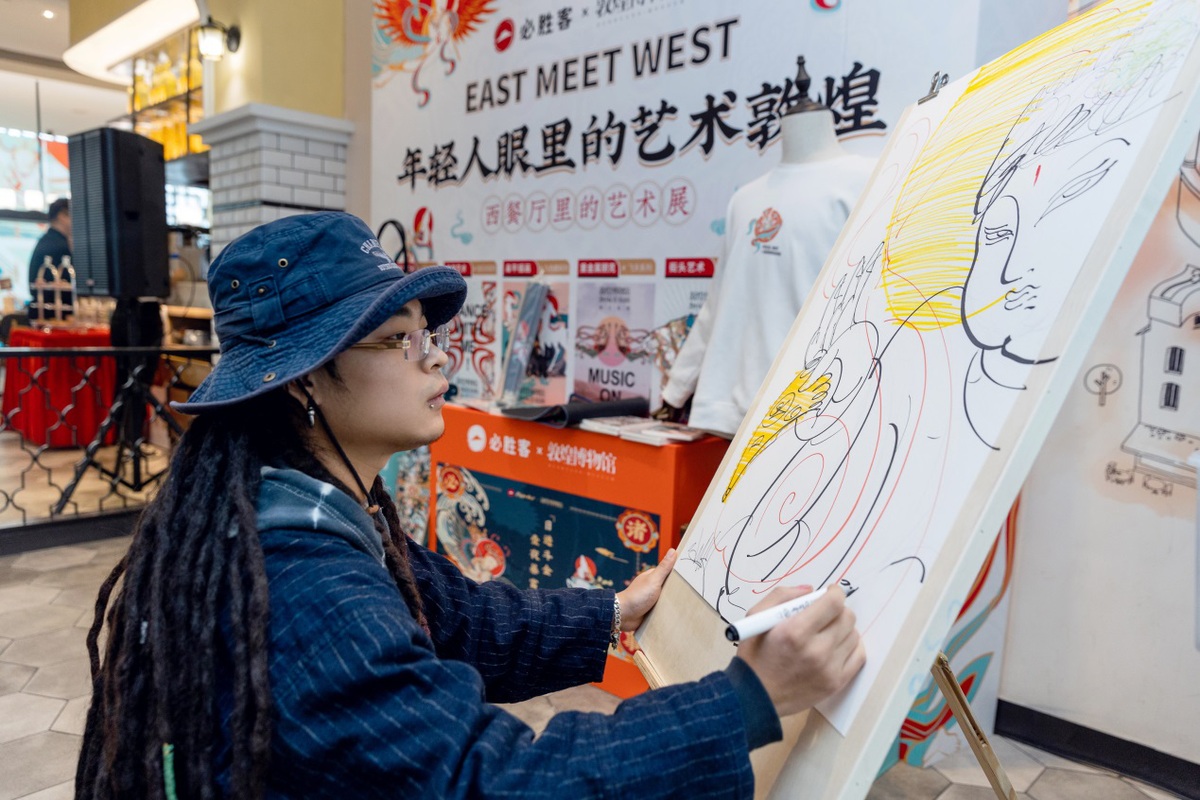 青年艺术家在必胜客敦煌主题餐厅现场作画