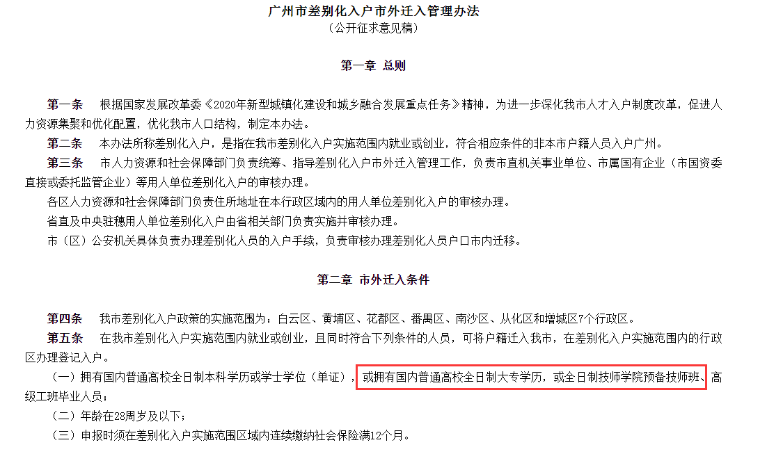 12月16日,广州市人社局发布了《广州市差别化入户市外迁入管理办法(公开征求意见稿)》,广州拟在白云区、黄埔区、花都区、番禺区、南沙区、从化区和增城区7个行政区实施差别化入户,入户门槛已经放宽到大专学历。