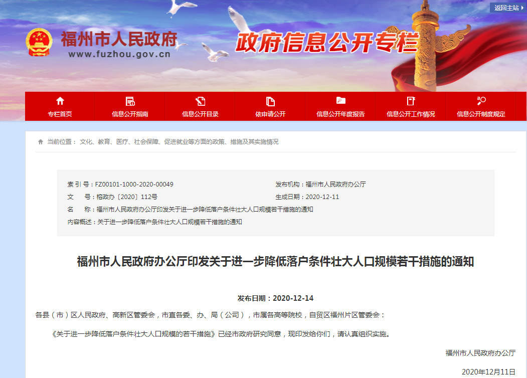 12月11日,福州市人民政府办公厅印发《关于进一步降低落户条件壮大人口规模若干措施》(以下简称《措施》),提出全面放开落户限制,实现落户“零门槛”。