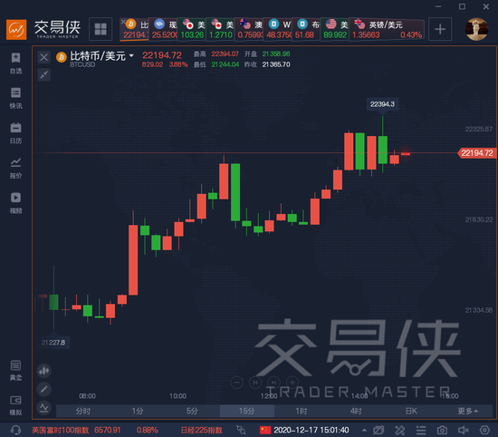 比特币也不甘示弱,亚盘站上22000美元/枚关口,续刷历史新高,日内暴涨1002.61美元,涨4.69%。