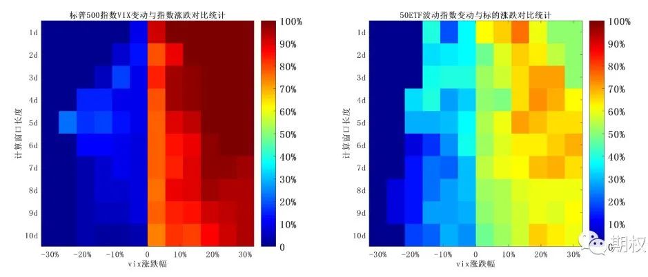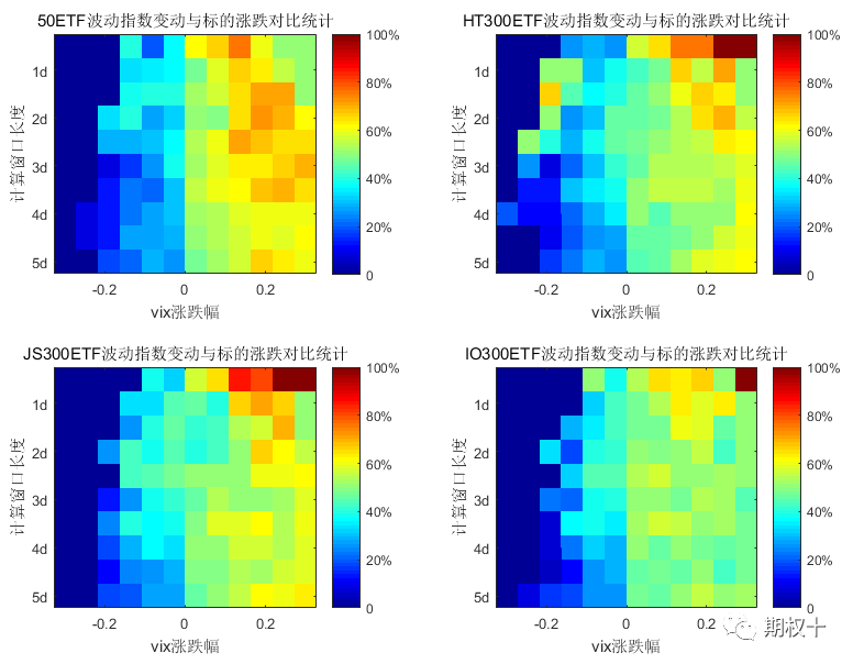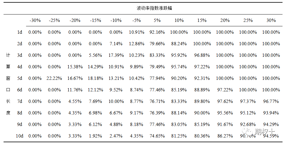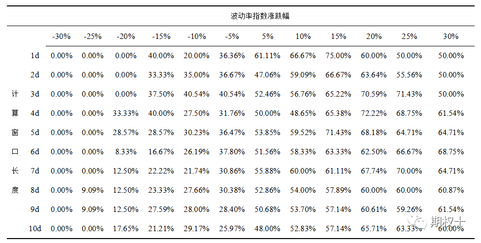 为进一步测度波动率指数的变动对标的涨跌的反应情况,我们对金融期权扩容以来的数据与同期标普500指数及VIX指数进行了对比分析。我们分别以1-10个交易日为计算的时间窗口,在波动率指数涨跌幅度处于不同区间内,统计对应时间段内标的下跌概率。从海外市场经验来看,当波动率指数出现大幅上涨时,往往对应于标的的下跌行情;当波动率指数出现大幅下跌时,往往对应于标的的上涨或震荡行情。