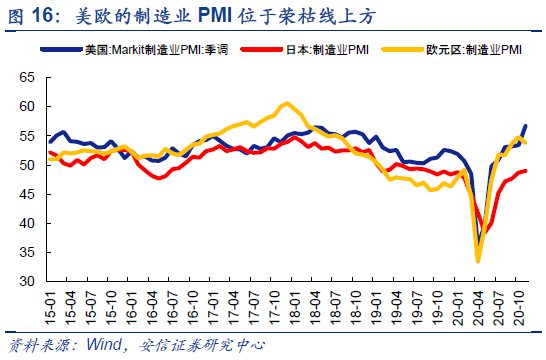 世界经济复苏将为后期我国出口主要拉动因素。OECD综合领先指标可以较为有效的反映世界经济发展周期,对世界发展具有较好的预测功能。中国作为国际贸易网络中的重要一环, OECD综合领先指标和中国出口同比的移动平均指标的变化具有较高的一致性。目前,OECD综合领先指标仍低于疫情前的水平,表明世界经济在恢复经济增长的过程中仍有较大的提升空间。近来,主要发达经济体的制造业在陷入停滞后也呈现良好的复苏态势,美欧经济体的制造业PMI连续5个月处在荣枯线的上方。疫苗普及后,预计制造业的扩张速度将会进一步加快,世界经济复苏进程提速将为此后中国出口的重要拉动因素。