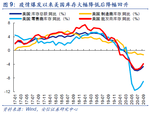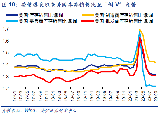 海外零售商补库存成为中国消费品出口继续保持强势的助推力量。以美国为例进行分析,美国库存总额在7月份触及阶段低点,之后降幅略有回升,存在强烈的补库存需求。这一观点从美国库存销售比的“倒V”型中将得到进一步的论证。尤其对于零售商而言,其库存水平下降幅度最大,库存销售比也显著小于疫情爆发之前的水平,表明零售商补库存的需求已“箭在弦上”。同时,值得注意的是,零售商补库存的需求强于制造商补库存的需求,这表明进口商品补库存的需求超过发达经济体本土制造商品补库存的需求。