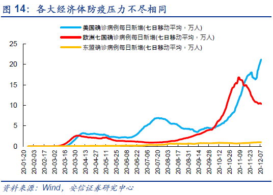 在疫苗大范围普及前,全球的疫情防控依然面临严峻的挑战。尤其是在入冬以后,全球新增确诊病例不断攀升,居高不下。美国疫情在感恩节假期迎来新一轮爆发,预计在圣诞节假期后将迎来更严峻的调整,欧盟疫情在10月封城令重启后效果显现,但每日新增确诊仍处于高位。我们认为,在疫苗大面积的接种前,美欧等发达经济体因疫情导致的国内供给不足的局面仍将延续。根据福奇博士的预计,明年4月份美国普通民众才可以大面积接种疫苗。新一任的美国总统拜登也立下承诺会在上任后100天内为1亿美国民众接种疫苗。因此我们预计,在明年一季度之前,中国仍将继续扮演世界各国尤其是欧美发达经济体供应链的“替代者”,这将是短期内中国出口继续保持高增长的重要动力。但随着疫苗开始接种,各国的供应链也将逐步恢复,中国出口“替代效应”在边际上会逐渐减弱。