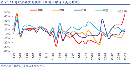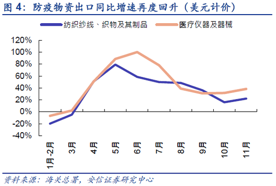防疫物资出口需求短期尚有一定支撑。受益于海外疫情二度肆虐影响,11月,我国医疗设备、纺织制品出口同比增速再度回升,分别高达38.4%/22.2%,环比上升6.3pct/6.8pct。海外疫情形势严峻,叠加上年同期低基数影响,该板块仍有望在未来3-4个月内保持较好出口表现。