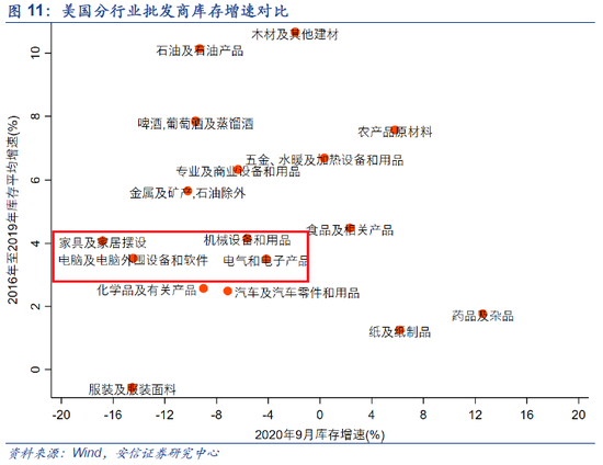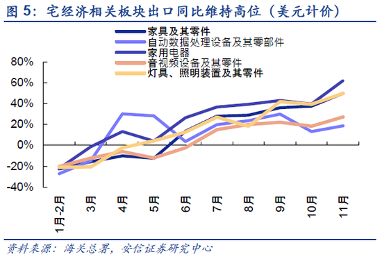 我们认为,在欧美主要国家对进口商品补库需求强烈的背景下,即将迎来的圣诞节和元旦节假日将进一步刺激其居民消费需求,这将进一步支撑中国消费品出口的强势。从出口的结构上看,家具及家居摆设、机械设备和用品、电脑及电脑外围设备、电气和电子产品等行业的补库存需求在细分行业中靠前,预计上述行业的出口将继续保持强劲势头。