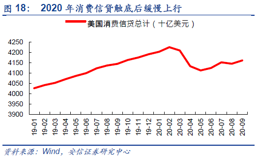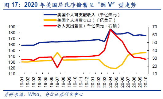 欧美经济刺激计划带动居民消费能力和意愿的双提升,利好后续中国出口表现。为应对新冠疫情的冲击,美国政府今年已推行了四次经济刺激计划。12月2日,美国两党参议员小组提交了新一轮经济刺激计划方案,该方案包括2880亿美元小企业援助,1800亿美元的失业福利,1600亿美元的资金短缺的州和地方政府救助,以及陷入困境行业援助(例如向航空业提供170亿美元救助)。除此之外,该刺激计划还包括交通,疫苗开发、分配和测试,教育,学生贷款和住房援助等。12月4日公布的11月非农数据和相关就业数据远低于市场预期,这将进一步加快美国两党推出新一轮经济刺激计划的步伐。同时,12月10日,欧洲央行公布的利率决议,将目前规模已达1.35万亿欧元的欧洲紧急抗疫购债计划(PEPP)再增加5000亿欧元,而且这一计划至少持续至2022年3月底(此前为持续至2021年6月底),这意味着PEPP将至少延长9个月。美欧等发达经济体的经济刺激计划,尤其是对普通居民发放的现金补贴将直接增加居民的收入,从而提升了居民的消费能力。另一方面,随着经济刺激计划的推进以及疫苗研发和接种不断取得积极的进展,美国居民净储蓄不断走低,反映出美国居民对未来前景的预期在转好,储蓄意愿逐步降低,消费意愿缓慢提高。这点由居民消费信贷在2020年5月份触及阶段低点之后开始缓慢抬升可同步验证。在普通居民的消费能力和消费意愿双提升后,整体消费水平和社会总需求将积极影响后续中国的出口表现。