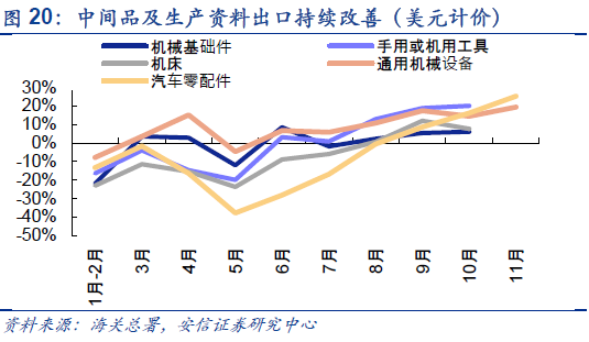 海外经济活动复苏,中间品及生产设备出口将继续回温。11月,通用机械设备和汽车零部件的出口数据继续改善,保持良好的增长态势。随着全球经济回温,欧美供应链恢复和生产活动将不断加快,各制造业中间品及生产设备的需求将延期释放。我国作为全球供应链中重要的中间品提供商,汽车零部件、电子元器件等产品出口有望同步恢复。而通用机械设备、机械基础件、机用工具及工程机械等生产资料则在后期有望受企业的扩产行为所拉动。