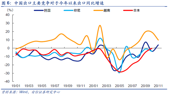 中国出口份额占比提升至历史高位。本次疫情中,由于疫情爆发时点错位,且抗疫表现出色,中国企业率先复工复产,承接了大量海外订单,出口份额在今年第二季度飙升至阶段性峰值17.22%(依据WTO数据测算)。从全球视角来看,中国的供应链优势正在显现。欧美疫情反复,供给端恢复持续受到扰动;东亚和东南亚疫情控制得较好,但疫情冲击带来的副作用仍较为显著,日本、韩国、印尼等我国主要出口竞争国直到目前出口表现仍不佳。越南出口恢复得较快,9-10月同比增速近20%,但11月出现了一定回落。我们认为,疫情冲击下,海外供给端部分产能永久性退出,叠加国内制造业竞争能力日益加强,我国出口份额占比的整体中枢水平将出现永久性提升。