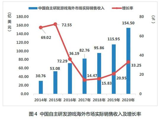 具体来看,中国自主研发游戏2020年海外市场实际销售收入达到154.50亿美元,比2019年增加了38.55亿美元,同比增长33.25%,继续保持高增长态势。