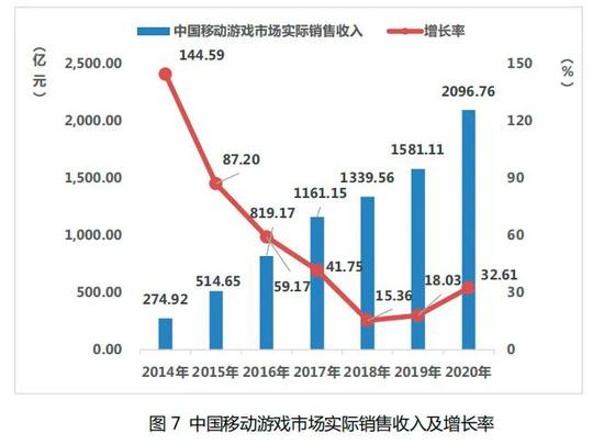 具体来看,报告显示,中国移动游戏市场2020年实际销售收入为2096.76亿元,同比增长 32.61%;手游用户数量达到6.54亿人,同比增长4.84%。