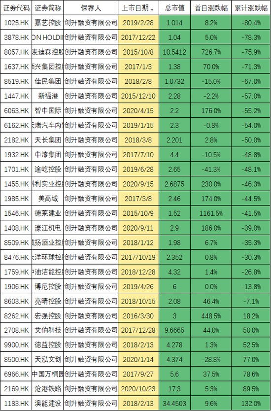 据新浪港股统计,创升融资保荐的新股,上市首日经常出现动辄暴涨几倍甚至10几倍的妖股,而这些公司的市值大都只有几个亿。梳理创升融资保荐股历史成绩,其保荐的27只股票只有7只股票实现了上涨,其它股票全部下跌,9只股票更是跌幅超50%,成为造妖股的知名保荐商。(文/金石)