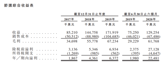 2017年到2019年,公司分别实现收入8521万美元、1.45亿美元、1.72亿美元,截至2020年中期,公司实现收入1.29亿美元,同比增幅72%。