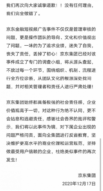 12月17日消息,京东集团今日发布声明,就日前京东金融低俗借贷广告一事再次道歉,称没有任何理由,我们完全做错了。京东表示此事责无旁贷,将从源头查起,不放过每一个环节,围绕组织、机制、流程进行全方位诊断,从团队文化的根源深处找问题,并对相关管理者和责任人进行严肃处理。