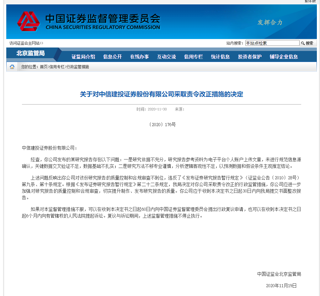 值得注意的是,早在11月30日,北京证监局同样曾因为中信建投的研报问题,发布了对公司采取责令改正措施的决定。
