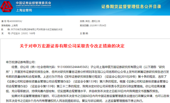 除了中信建投,11月4日,上海证监局对申万宏源证券下发责令改正的监管函,因其在发布证券研究报告过程中,未对分析师刘某在冠以公司名称的公众号上发布的某篇证券研究报告进行发布前的质量控制和合规审查。上海证监局要求申万宏源证券持续完善内部控制,切实提高合规管理水平。