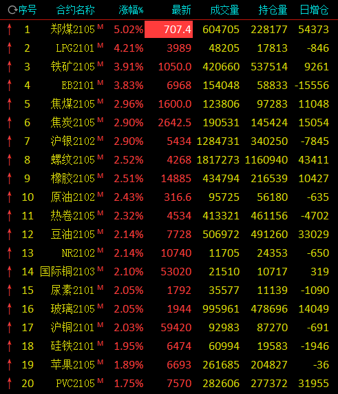 热点栏目12月18日,期市早盘大面积上涨,动力煤涨停,铁矿石续创上市新高涨近4%,焦煤、焦炭涨近3%;有色能化多数上涨,LPG涨逾4%,苯乙烯冲高回落涨近4%,国际铜、沪铜、橡胶、原油、豆油、玻璃涨逾2%;跌幅方面,鸡蛋跌逾1%,纯碱跌近1%。