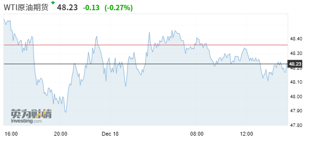 亚洲时段,美油高位回落,现报48.23美元/桶,跌幅0.27%。