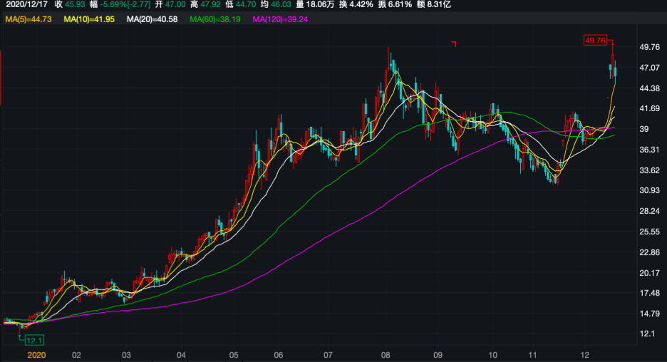 此外,在蒙牛入局、股价猛涨后,妙可蓝多的股东和董监高选择了减持。截至2020年12月17日收盘,妙可蓝多报收于45.93元/股,当日跌幅达5.69%,市值为188亿元,PE为212.4倍。