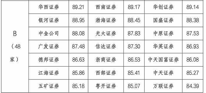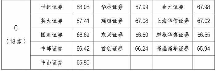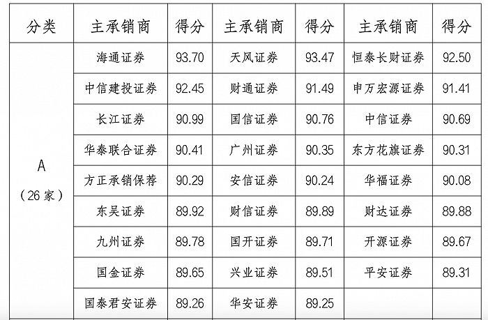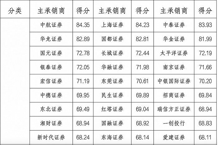 B类主承销商中,华西证券得分最高,为89.21分,距A级末名平安证券仅0.1分的分差;C类主承销商13家,中山证券得分最低,仅65.85分。
