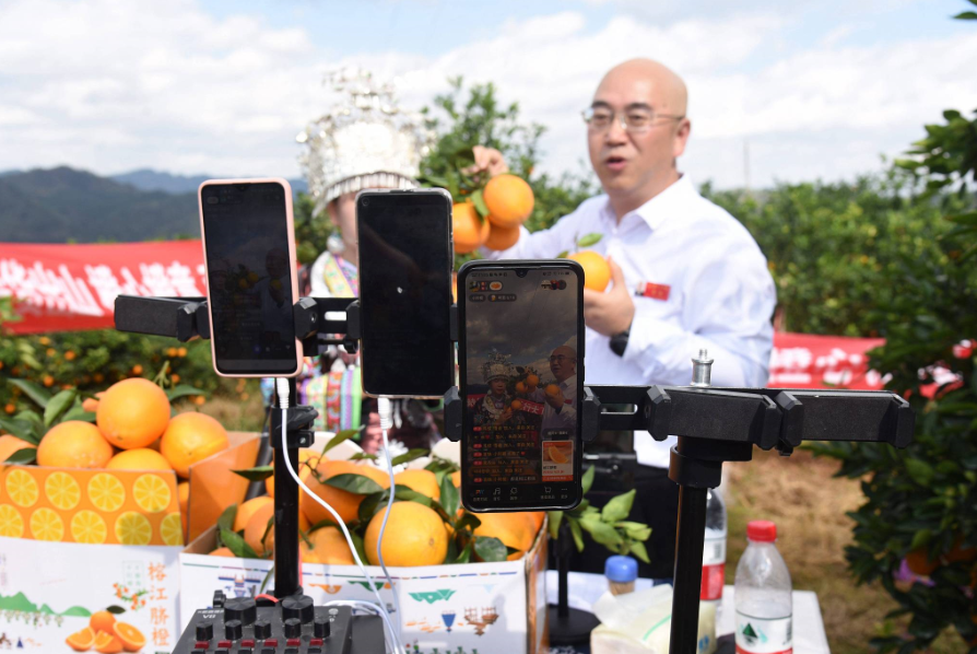 ▲2020年11月18日,在贵州省榕江县古州镇西门坡脐橙基地,榕江县人民政府副县长黄剑(右)和电商网络主播在进行网络直播。图/视觉中国