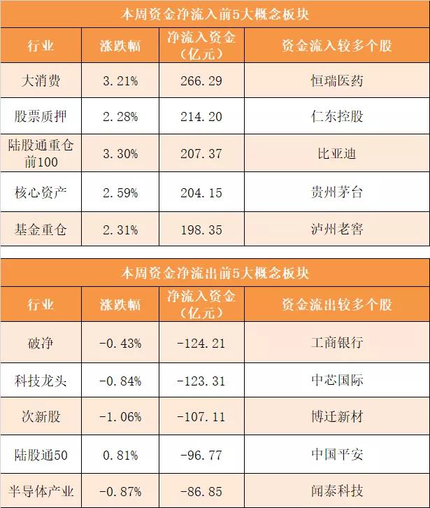 概念板块方面,本周大消费、股票质押等概念板块资金呈现净流入,其中大消费概念净流入266.29亿元居首。