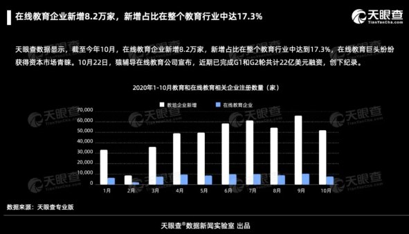 天眼查报告显示,疫情严重的上半年,全国新增23.5万家教育相关企业,尤其是到了3月,新增企业数量暴增。截至10月,2020年新增教育相关企业47.6万家,注销13.6万家,净增34.0万家。在线教育企业新增8.2万家,新增占比在整个教育行业中达到17.3%。