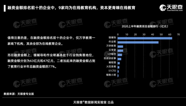 在线教育备受资本青睐。天眼查《2020教育行业发展报告》显示,截至今年10月,融资金额排名前十的企业中,9家均为在线教育机构。