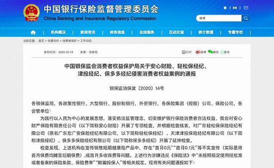 12月18日,银保监会消费者权益保护局发布关于安心财险、轻松保经纪、津投经纪、保多多经纪侵害消费者权益案例的通报(下称“通报”)。