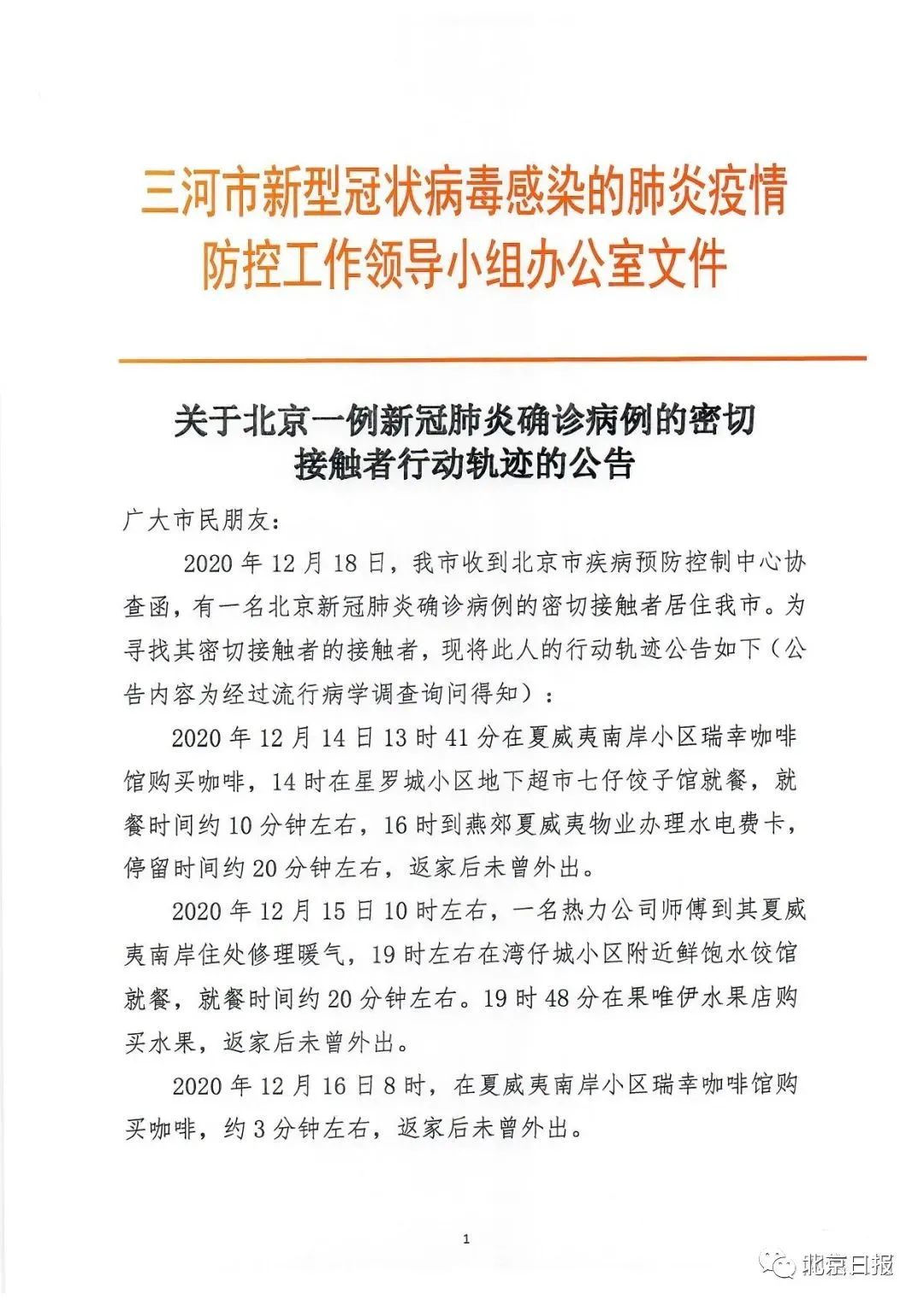 据“网信三河”微信公众号18日晚消息,河北省三河市收到北京市疾控协查函,有一名北京新冠肺炎确诊病例的密接者居住三河市。为寻找其密接者的密接者,公布其行动轨迹。