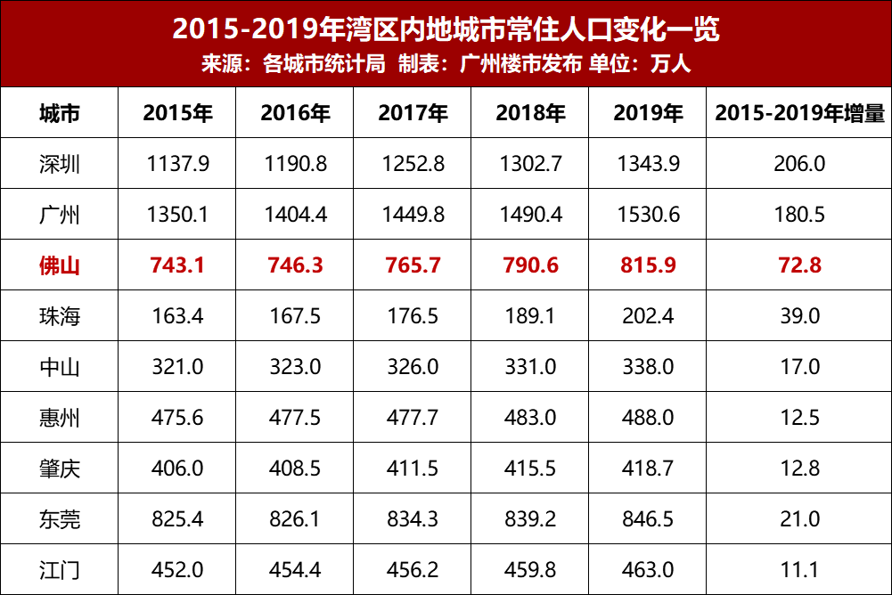 根据市统计局信息,2019年末佛山常住人口达815.86万人,一年内增长25.29万人,首次突破800万大关。