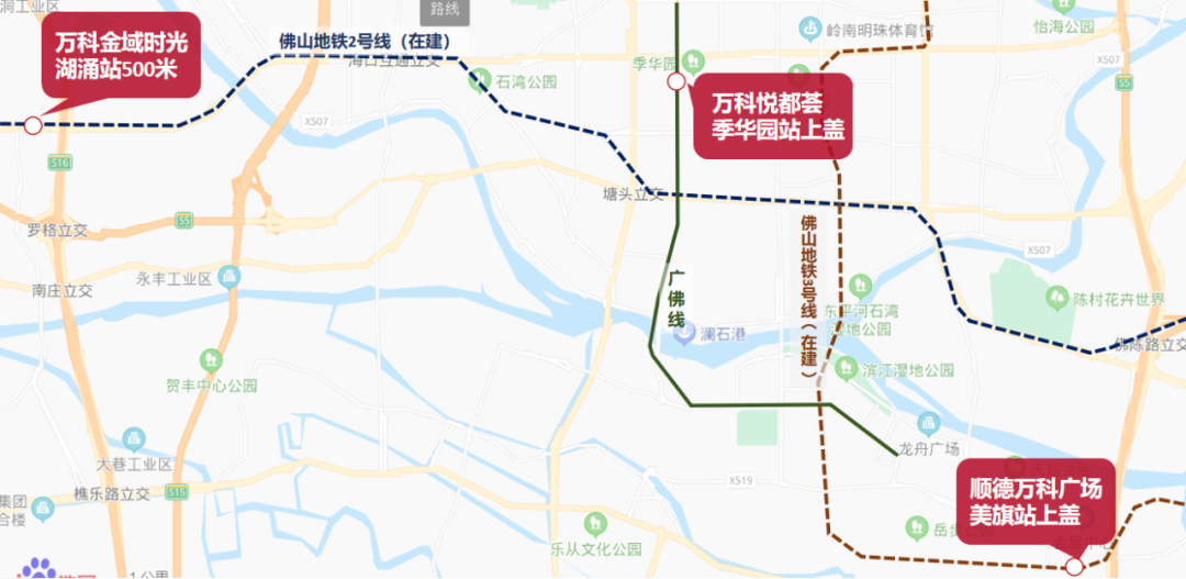 距离佛山地铁2号线(在建)湖涌站约500米的万科金域时光、3号线(在建)美旗站上的顺德万科广场、以及季华园地铁站上盖的万科悦都荟,三大项目任君选择。