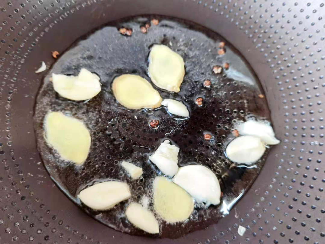 3.花椒粒、姜、蒜放入锅中,小火慢熬至香味渐起