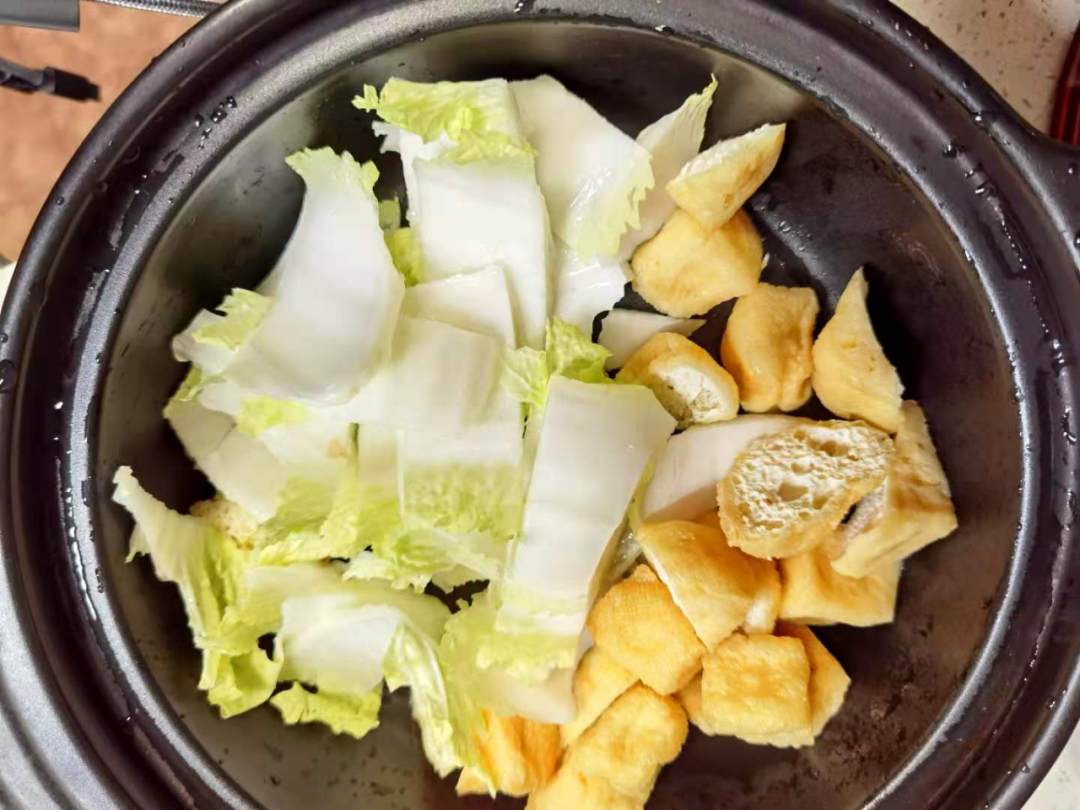 6.另取砂锅,放入喜欢的底菜,如白菜、粉丝、金针菇、豆制品(油豆腐、冻豆腐)等,将煮好的牛肉倒入,再在砂锅中炖10分钟左右即可