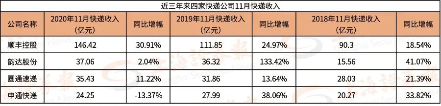 其中,韵达股份在经历了去年逾133%的高增速后,今年11月的快递业务收入同比增速下滑至2.04%。圆通速递11月的快递收入增速也从13.64%下滑至11.22%。申通快递的经营状况更是急转直下,11月快递业务收入24.25亿元,同比下降13.37%。