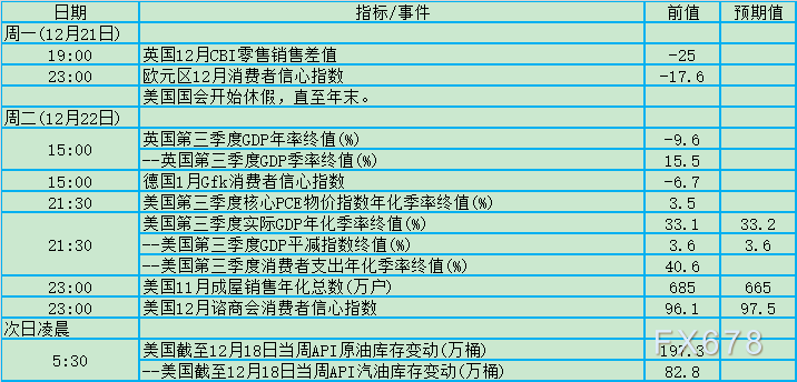 12月21日-27日当周,由于欧美国家普遍迎来圣诞假期,金融市场流动性料十分清淡,宏观面数据也较往常明显偏少,而且不少数据会提前公布,主要关注美国消费者信心指数、PCE物价指数、耐用品订单和中国工业利润等数据。事件方面,继续关注美国国会财政刺激磋商和英欧贸易协议谈判的消息。