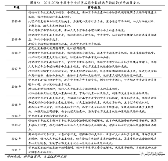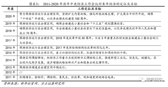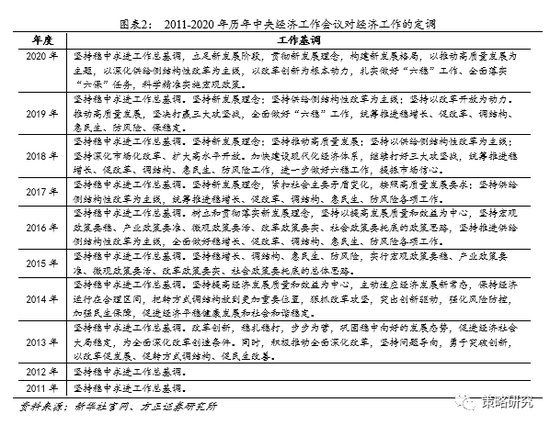 宏观政策一脉相承,强调连续性、稳定性、可持续性,基调相当于回到2019年疫情前。从历年中央经济工作会议表述对比来看,今年经济形势更加强调了外部的不确定性,经济定调上一脉相承了“六稳”,“六保“工作,并以深化供给侧改革为主线。财政货币政策总基调与2019年保持不变,但边际上有所收紧。2019年财政政策提出“提质增效”,今年增加了“更可持续”,并提出要“抓实化解地方政府隐性债务风险工作”。2019年货币政策提出“灵活适度”,今年扩成了“灵活精准、合理适度”,并提出“保持宏观杠杆率基本稳定”。总体来看,基调温和回归,基本上回到了疫情前的水平,并更讲究精准性,防风险和稳杠杆的提出表明了财政货币政策上有保有压,边际收紧。